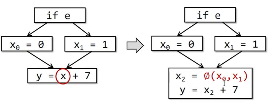 这里解决的办法就是使用一个合并操作符$\phi$(phi-function),根据控制流的信息确定使用哪个变量。
