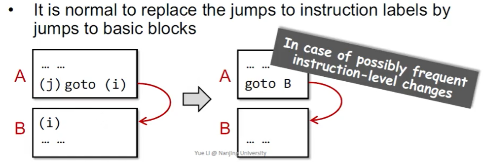 注意到每个基本块和开头指令的标号唯一对应,因此很自然地,我们可以将跳转指令的目标改为基本块的标号而非指令标号: