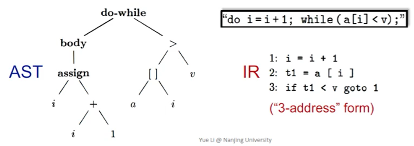 - AST 缺少控制流信息,IR 包含了控制流信息:AST 中只是有结点表明了这是一个 do-while 结构,但是无法看出控制流信息;而 IR 中的 goto 等信息可以轻易看出控制流。
