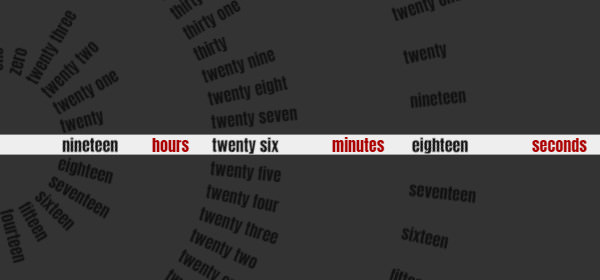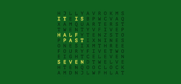In this clock, the approximate time (it has an error of +/- 4 minutes) is displayed via text, highlighting the current time in a bright color while the rest of the letters are darker.