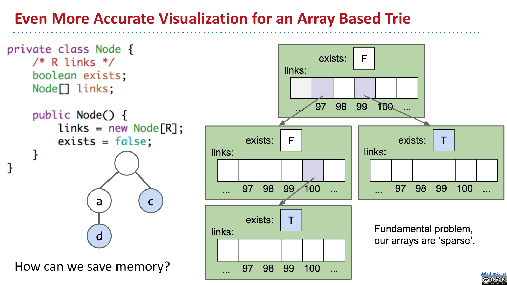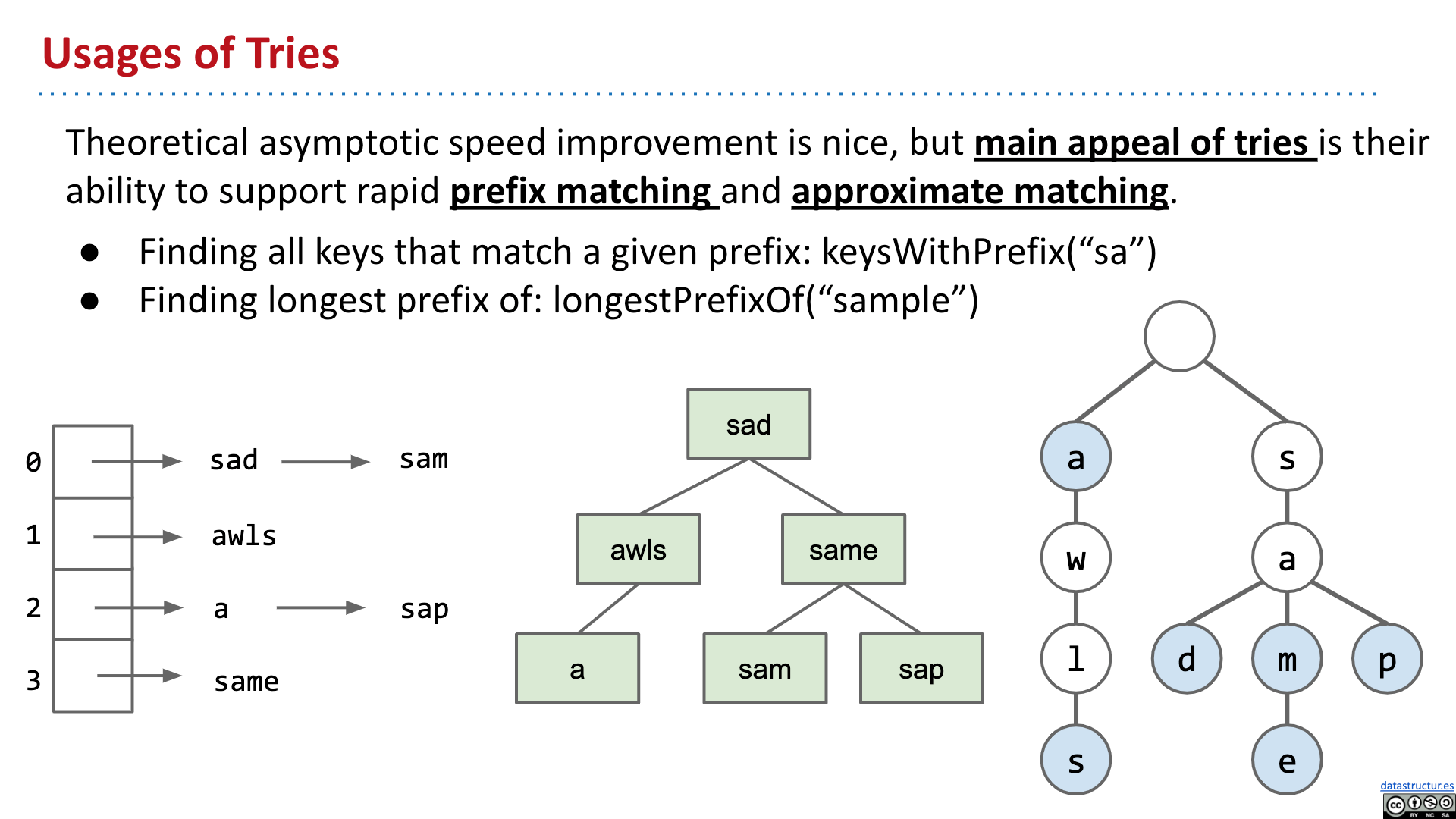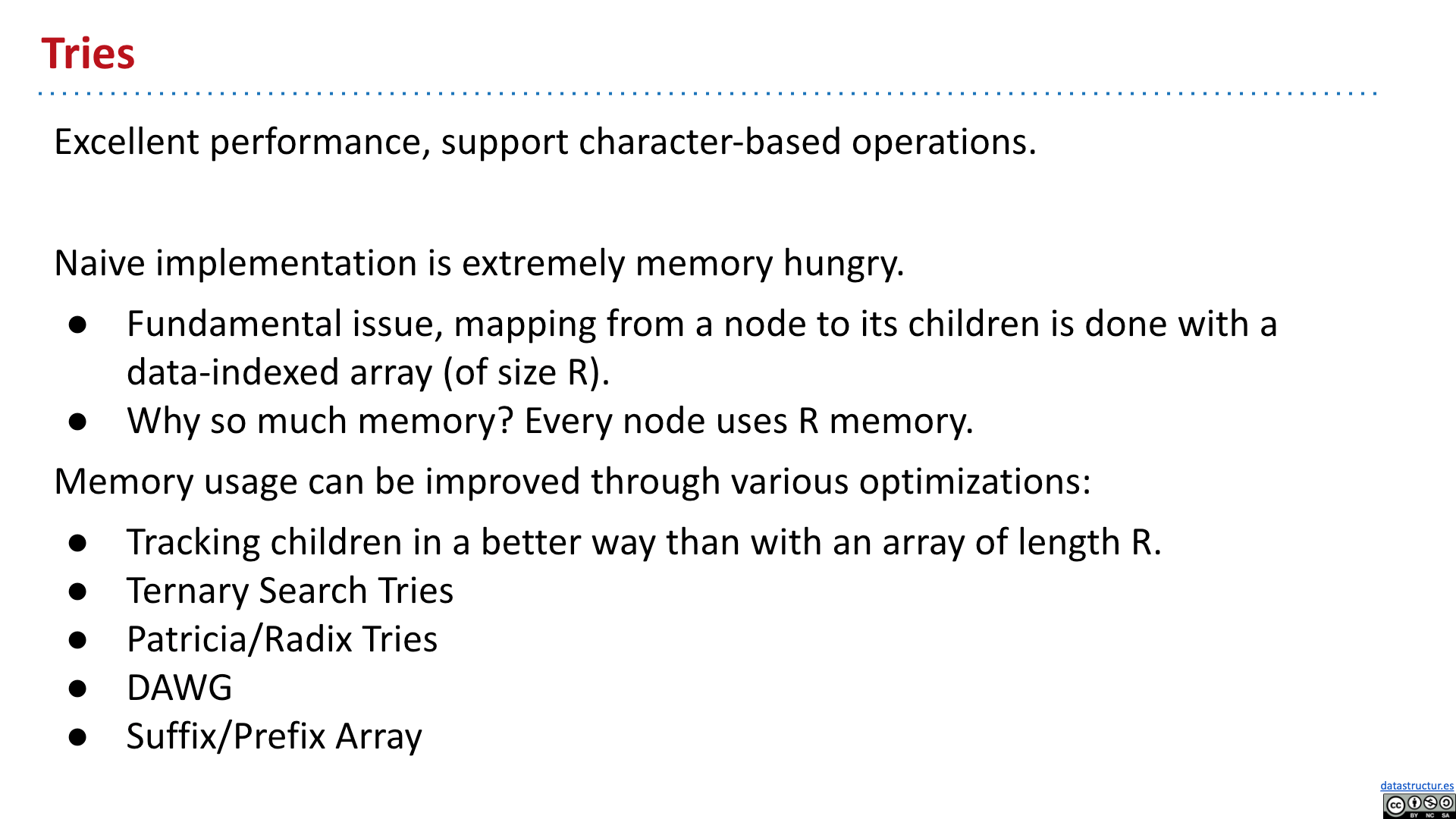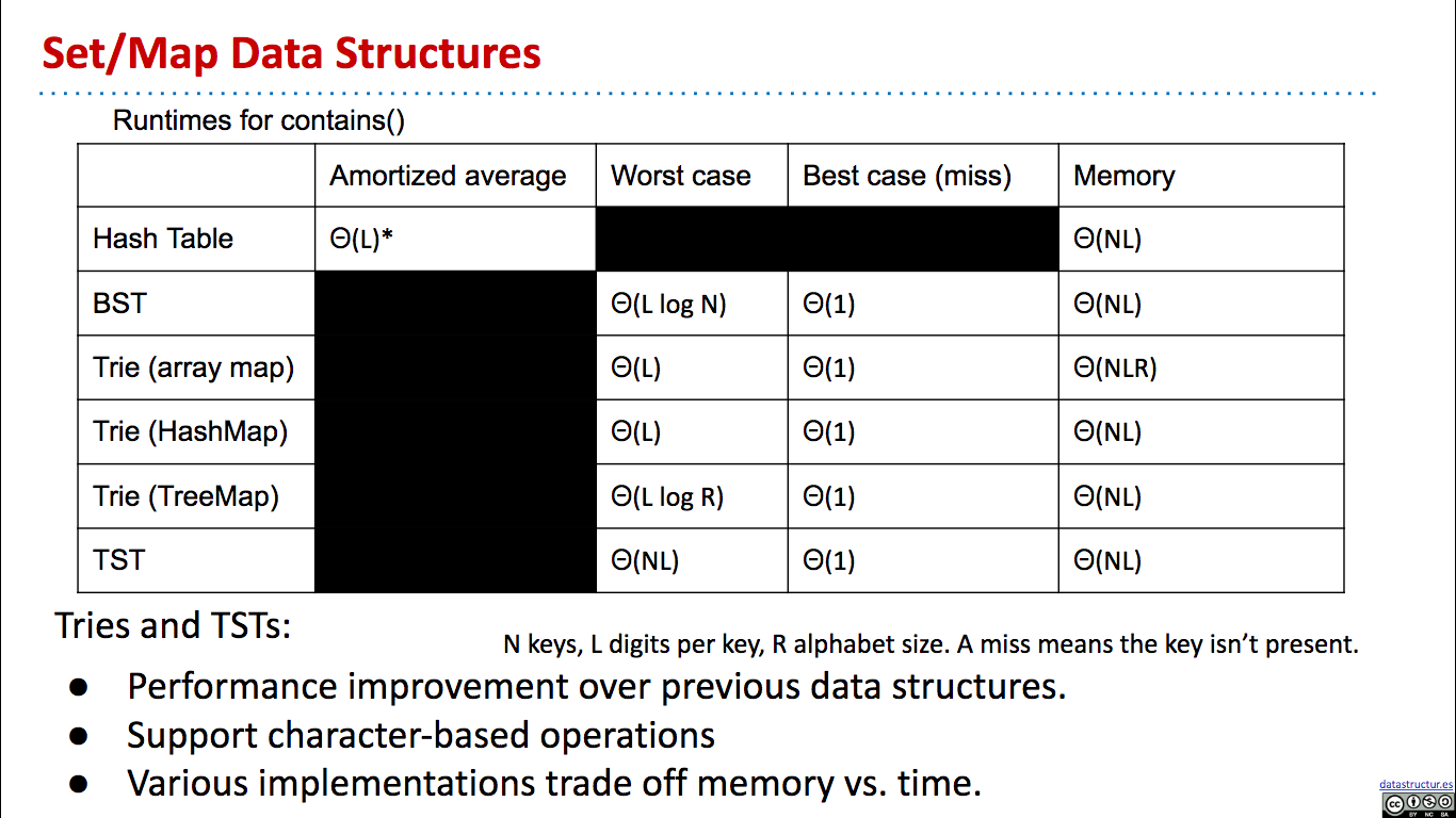 # Summary - Introduction - Tries - Tries Implementation - Child Link Optimization - Ternary Search Tries 2019 Lecture 21 Prefix Operations and Tries #105 # Introduction   # Tries       # Tries Implementation and Usage          # Child Link Optimizations       # Ternary Search Tries